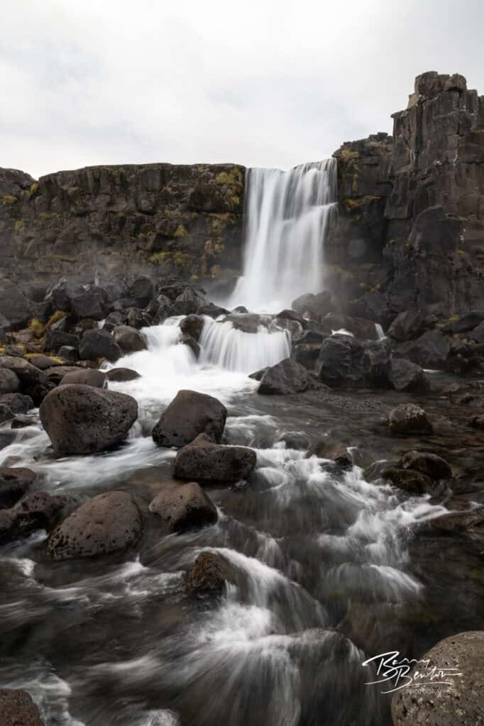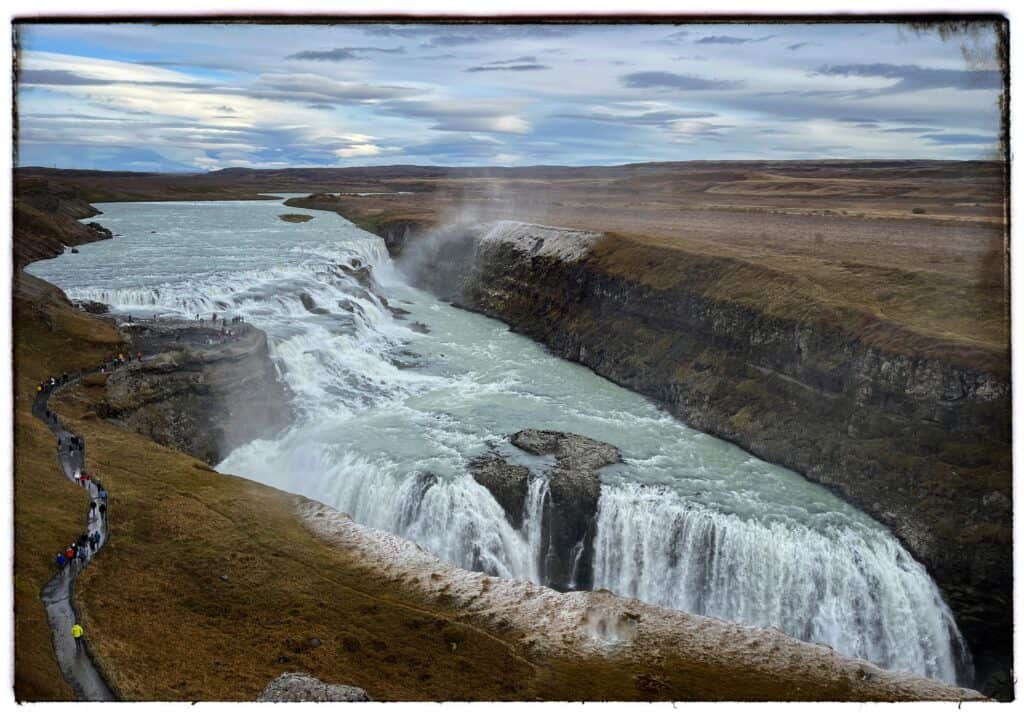 Easy trails connect much of the sights in this area including the first of our many, many waterfalls in Iceland. Oxararfoss (Icelandic hint – if it ends in foss, it is a waterfall ) is manmade to help with runoff from the nearby glacier. If continue the trail away from the waterfall, you reach an overlook and might recognize the canyoned area from Game of Thrones. Trails also lead left to walk to the original Assembly area. Here a maze of connecting boardwalks take you to Thingvallakirkja, the most photographed church in Iceland. You can also hike up to an area where the North American and Eurasian teutonic plates come together. Those who are more adventurous can book a diving tour to go into the water and see the plates up close.