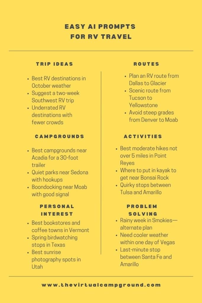 AI can make great suggestions for campgrounds, but it can’t book it (yet). But it can make suggestions on routes with side trips that are worth the time. It is great for helping you ensure you see the “right” things in the area whether that is the most popular spots or the ones that fit your interest the best.