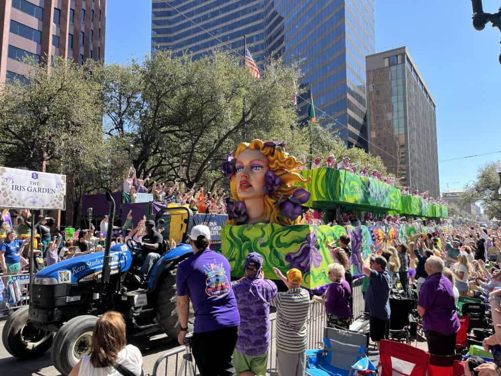 I was overwhelmed by how much they throw from the floats. And no, indecent exposure is not required. You can join in the fun of yelling – “Throw me something mister” – or just raise your arms up. Lucky for me, my husband is pretty tall so his arm reaches far and can catch a lot. Though, I was impressed by how much I caught. The trick is to get a float rider’s attention and look pleadingly or say please. At least that seemed to work for me in getting the more “valuable” items.