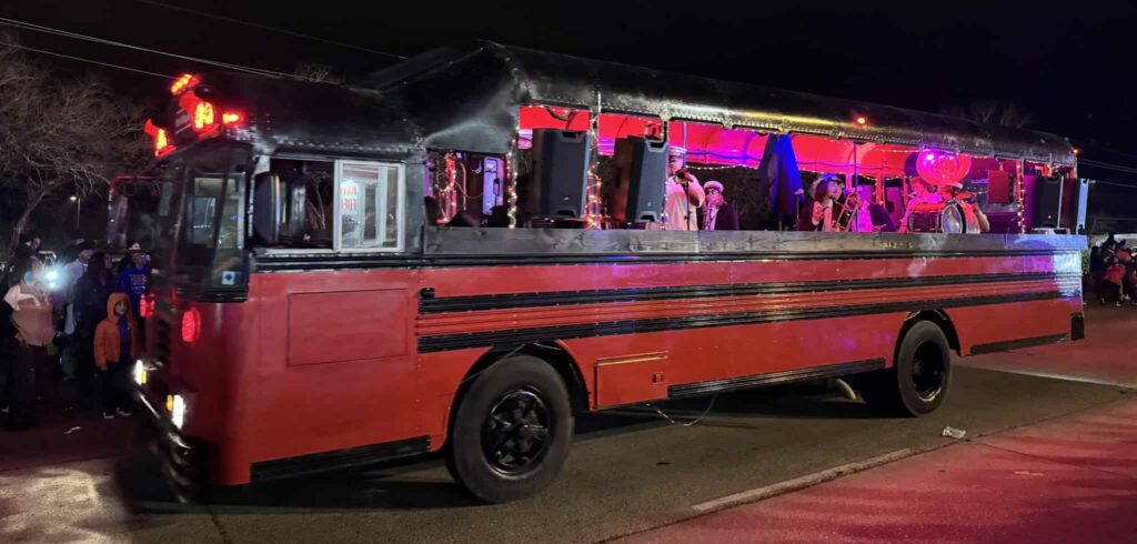 The night floats feature lots of colored lights, but all the floats were very impressive. Even the local parade on the West Bank had lots of lit parade entries and grand floats. They also feature bands from high schools and universities, a few from as far away as Georgia.