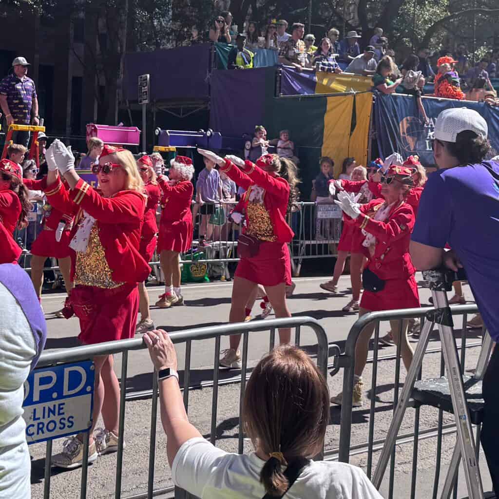 5. Layer up: Dress appropriately and by that I mean, look the part of a Mardi Gras attendee. Wear colors and wild hats or boas. You want to attract attention especially if you want to nab some beads. But also be aware of the forecast and bring layers. We went from cool in the shade to hot in the sun and back to shade within a few hours – in one spot.