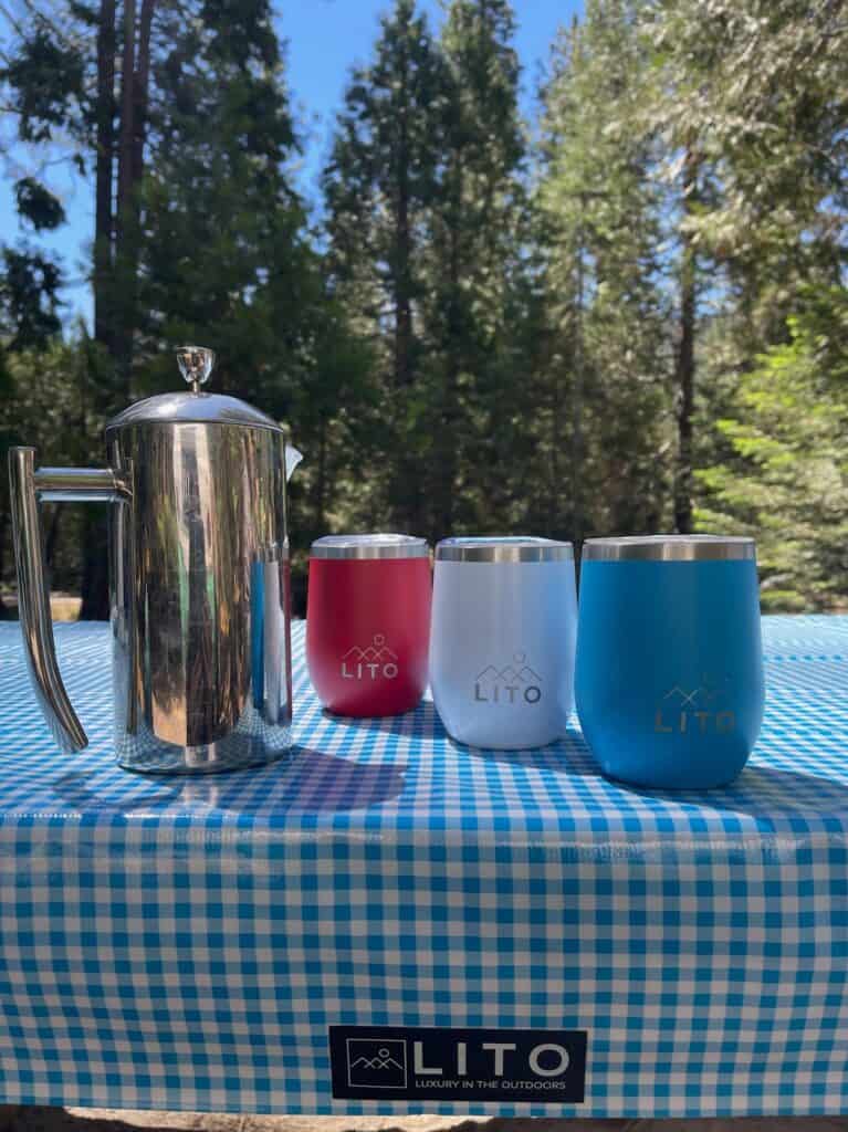 #3 USE NICE DRINKWARE. What you drink out of matters! Paper and plastic just don’t cut it when it comes to drinking your favorite beverage, whether it be coffee, iced tea or a cocktail. Spend an extra few dollars on nice drinkware to level up daily life. We love the LITO stainless wine tumblers because they are reasonably priced, great quality, and keep drinks at the correct temperature for hours. Plus, they come in cool colors that also happen to match their tablecloths so why not!. We especially also like that their tops are leak-proof (too many accidents have proven that is necessary) and the tumblers fit nicely in our hands – they aren’t too big and bulky.